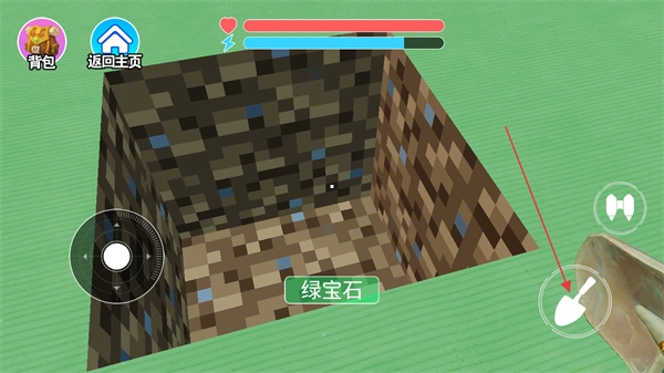 进入游戏关卡后,点击界面右侧的铲子按钮,通过挖掘地块收集绿宝石等矿石资源,以此积累财富。