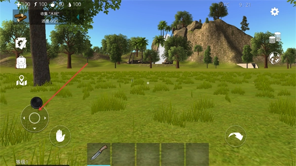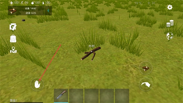 3、发现场景中的木材资源后,点击手掌形状的交互按钮即可拾取该资源,这会推进收集木材的任务进度。