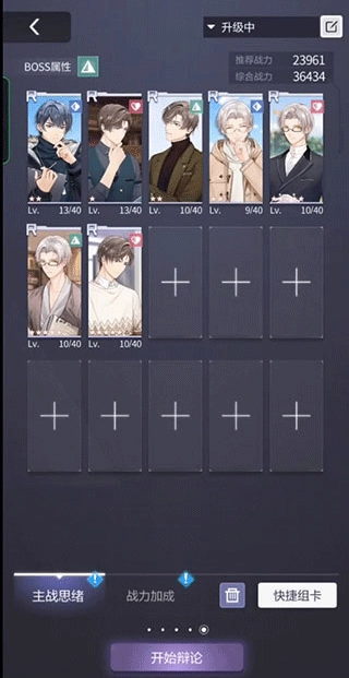 再来聊一聊这款游戏的战斗系统,乙女向游戏大多会在战斗上做一些简化,未定事件簿也没能免俗,不过这也是基于游戏特色做出的减法。游戏的战斗系统大概可以简化为比大小,再和主角律师的身份相结合就表现为嘴炮。虽然战斗系统是比较简化的,但是制作上还是看得出比较用心的,每一个不同的敌人都有对应的辩论台词,初玩的时候也比较有新鲜感。另外,嘴炮的bgm也很应景,配合“言尽于此”很有辩论胜利的快感。不过战斗系统还是有一些问题,一方面是在主线中的安排不是很恰当,会有些出戏。另一方面,游戏中有一些需要重复刷的素材本,而战斗系统没有跳过功能,可能就会显得有些枯燥。总的来看,战斗系统作为为游戏性服务的一部分,有亮点也有缺憾吧。