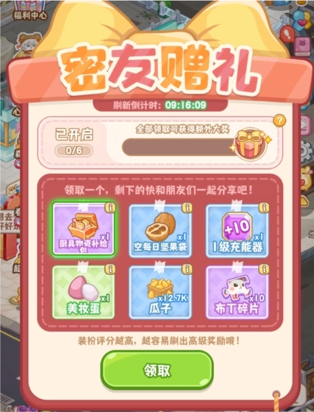 各位店长每天都能从六个选项里任选一个,领取到瓜子、钻石这类礼物,接着把它分享给好友。等把剩下的五个奖励都领完,就能拿到豪华招募券*1和山竹的礼物*1啦。