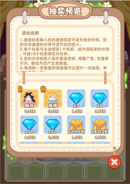 各位店长邀请好友程辉伙伴后,就能用贡献值参与抽奖,赢取瓜子、钻石等奖励,还有机会获得顶级员工。
