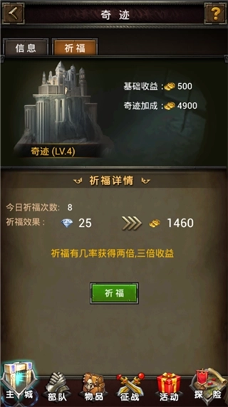 概述:奇迹的核心功能是提升金币收益,同时也是其他建筑升级的关键前提——只有奇迹达到特定等级,才能解锁对应建筑的升级条件。奇迹包含信息介绍与祈福两大板块,当英雄等级达到12级时,该功能即可开启。