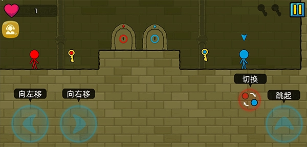 1、进入游戏后,玩家需通过向左移、向右移的操作来控制冰火人的移动,而切换按钮的作用是切换当前操控的角色。