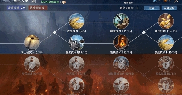 2、军事天赋:该天赋围绕军队战术展开,进一步涵盖不同兵种战术、城防器械杀伤效能、士兵训练强化等领域,能为领主提供军队攻击防御、城防器械攻击等战斗相关的增益效果,助力提升军事实力。