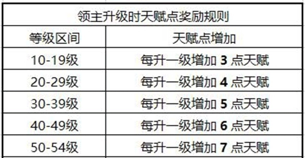 3、领主学习天赋时需消耗一定数量的天赋点,天赋点通过领主升级获取。领主等级达到10级时,可获得17点天赋;等级达到60级满级时,可获得278点天赋。关于天赋点的奖励规则,具体如下: