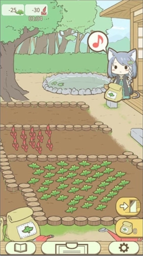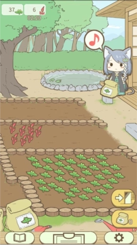 5、室外就是我们的药圃了,这里生长着各类药草,就像农场一样会定时生长,需要手动采集,我们也可使用道具让右上角的小猫帮我们打理。