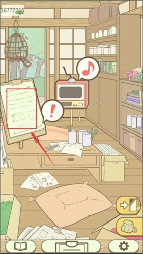 1、首先我们来到了游戏的室内界面,这里有一台看广告获取奖励的电视,还有一块发布帮助信息的画板,我们现在点击这块画板。