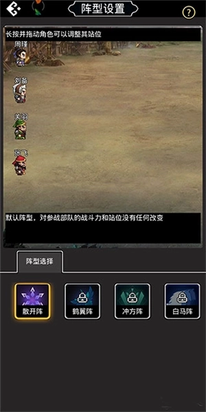 设置不同的阵型可以为参战部队带来不同的属性加成,在战斗中若是己方剩余的参战队员少于三人,则阵型将会被敌方打破,失去相应的站位和属性加成效果。