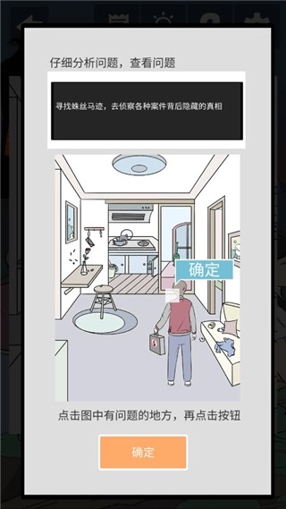 1、进入游戏,根据蛛丝马迹分析找出线索,点击确认查看是否正确。