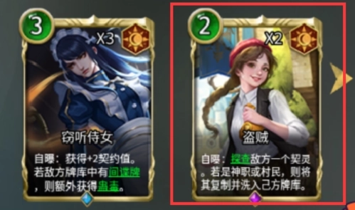 盗贼妹子的自爆技能可以选择对方的一张牌,要是这张牌是神职或者村民牌,就会复制该卡牌并洗入己方牌库。