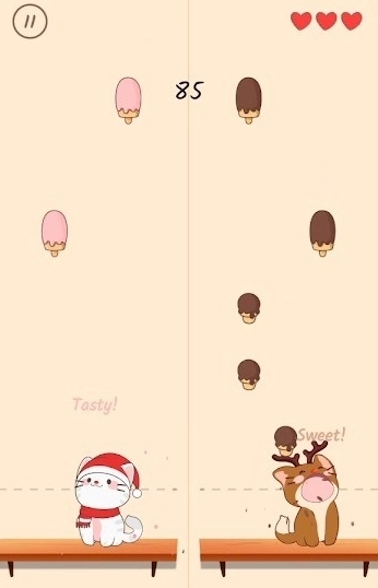 2、当屏幕上方的冰淇淋掉落时,赶紧滑动猫咪,让猫咪接住掉落的冰淇淋以获得相应分数;