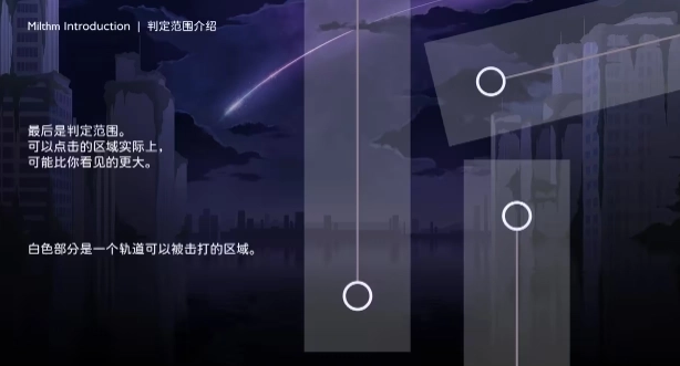 2、然后是判定范围。可以点击的区域实际上,可能比你看见的更大。白色部分是一个轨道可以被击打的区域。