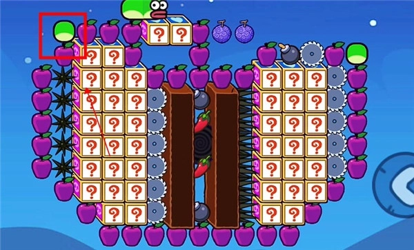 1、在《贪吃的苹果蛇》里,存在着不少苹果、炸弹和箱子。首先要做的就是把尾巴推掉,不过要注意,别在如下图中标红的绿色尾巴那个位置操作。