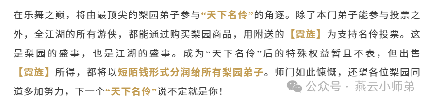 梨园的拿手本事,各位小东家想必都清楚,那自然是乐舞了。梨园弟子的成长历程,也是一位江湖名伶大家的诞生之路。凡是发布自己演奏的曲目、精心绘制的各类形象、编排的戏乐剧目等内容,要是能得到知音的点赞和赏识,就能获得人气!