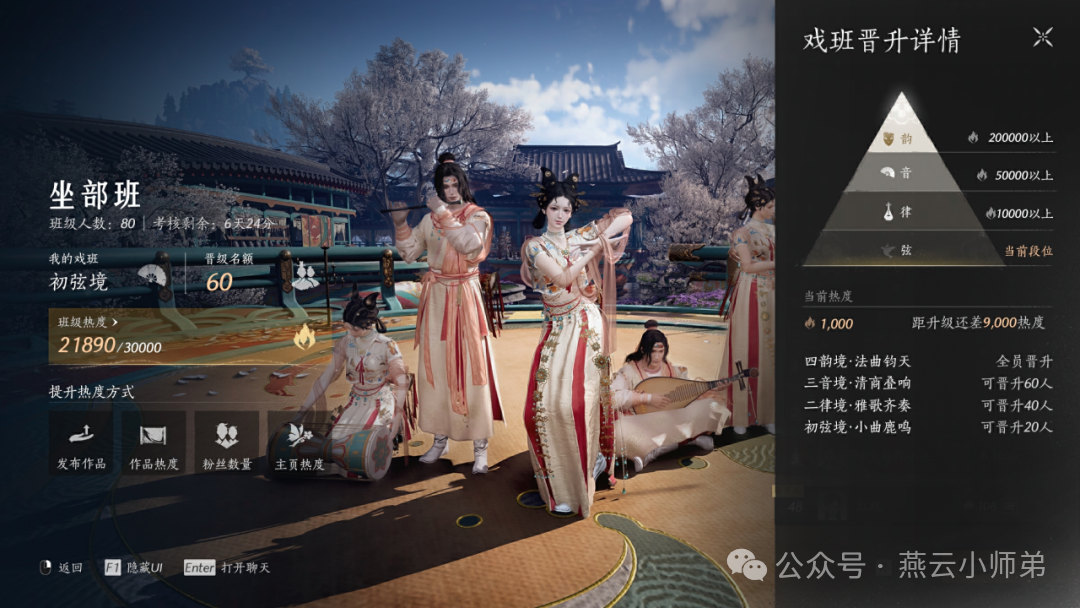 梨园里推出了【戏班】这一全新制度,这里的地位排名除了常规的功绩排名外,还设有依据弟子汇集情况的戏班热度榜!借助这个热度榜能推动戏班等级提升,而且戏班等级越高,其晋升的比例就越大,降级的比例也会越小。