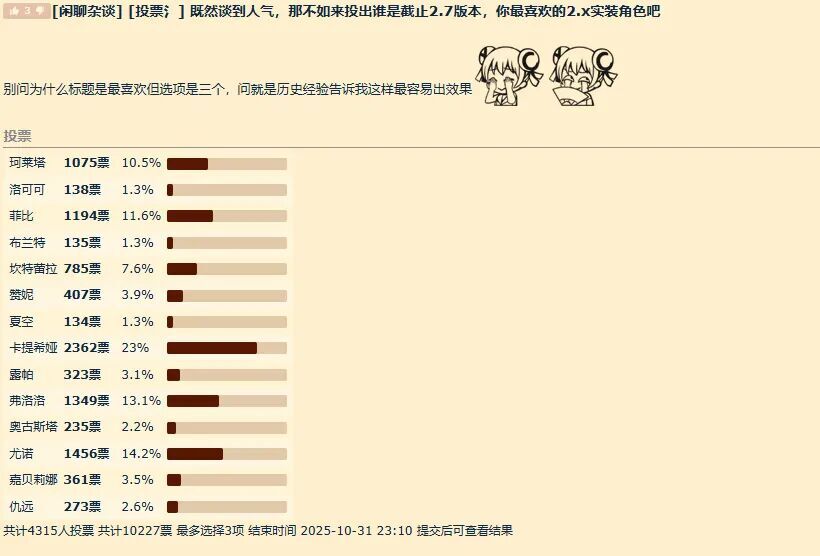 ✦NGA万票评 2.0人气角色 NGA发起了针对2.7版本前角色的万票人气评选,结果显示卡提希娅以断层优势位居榜首,尤诺紧随其后排名第二,珂莱塔位列第三,而船长、洛可可与夏空则并列倒数。这一投票结果被扩散至各大游戏社区后,引发了不少争议讨论——有人聚焦角色强度问题,有人提及强绑定机制的影响,其中最受关注的当属角色性别相关的争议。由于NGA平台本身男性玩家占比较高,且鸣潮玩家群体的男女比例约为9:1,从角色性别维度来看,此次投票结果或许更偏向男性玩家的偏好倾向。
