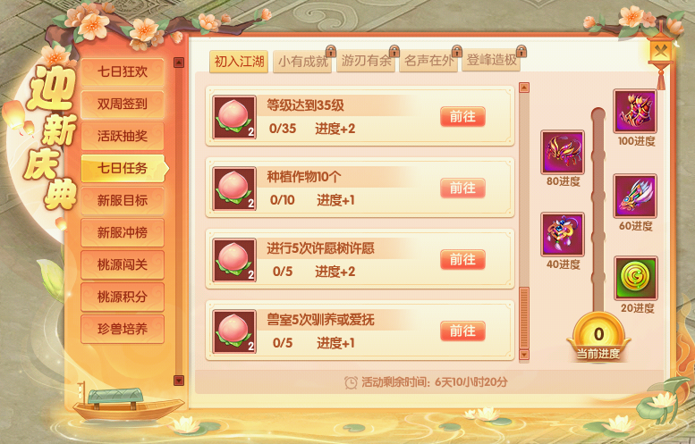 助力萌新快速成长,欢乐升级赢取丰厚奖励!新服务器开启的前7天,每日活跃度达到50、100、150时,都能获得抽奖资格,奖品包含高额金票、桃源积分、外观道具等,更有机会抽取神兽小悟空!还有海量经验、银票、金票、宝石礼盒、宝宝装备等实用好礼,让每一次升级都洋溢着喜悦!