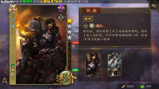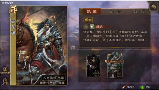 界华雄的这个武将副作用有所减轻,当我们受到的杀伤害不是红杀时,就能摸一张牌。这个效果和华雄本身较高的血量搭配起来实用性很强,不过没必要为了触发这个技能就经常主动卖血。