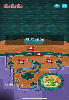 这关就比较简单~水每次会喷射出一部分~注意避开地雷,然后顺着小鸭子轨迹挖开土即可。(也可以分流两次分别拿下面的两只小鸭子~看个人)