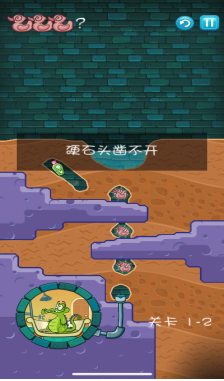 这一关也很简单~关卡名叫做“硬石头撬不开”,这里说的硬石头就是紫色的那块哦~只有土是可以挖开的,得沿着小鸭子的移动轨迹挖一条蛇形的路线,这样最后就能通关啦。对了,别忘了挖开左边最上方的土层,那里可以收集到绿色小瓶子这个物件~