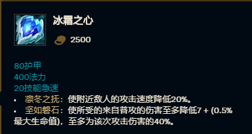 冰霜之心这款装备长期以来都处于比较冷门的状态,在新版本中,它的攻速削减效果从15%上调到了20%。如此一来,新版本的冰心对于依赖攻速的英雄克制力更强了,只要有出的需求和条件,就一定要选择这件装备。