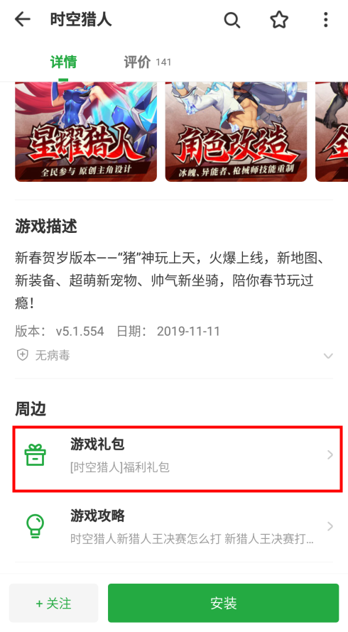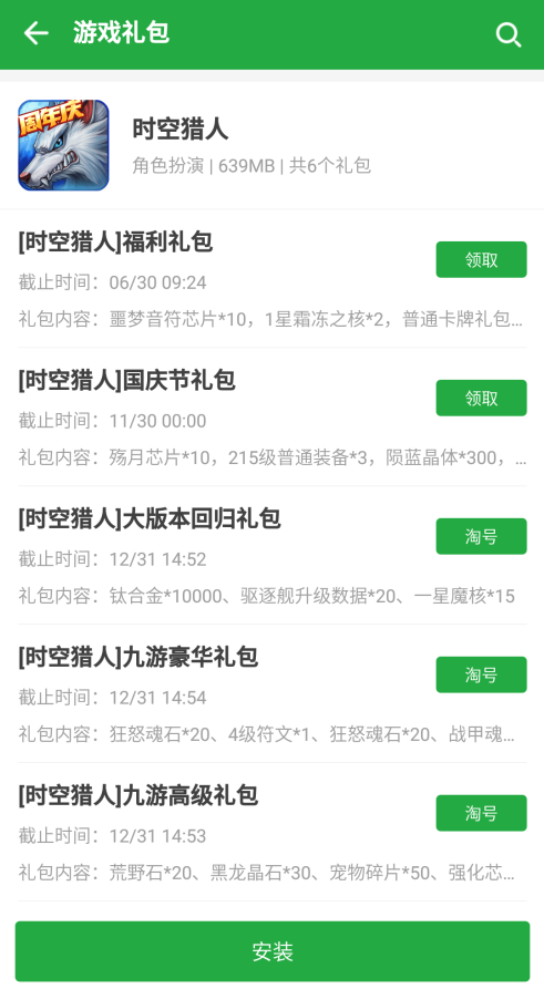 在豌豆荚下载并安装好《时空猎人》的玩家,可点击进入游戏详情页面,在该页面的“周边”板块中找到游戏礼包入口。点击进入游戏礼包页面后,就能查看各类礼包的具体内容以及对应的领取截止时间。