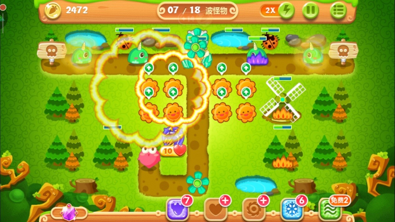先在萝卜右上角放置一个多重箭并将其升级到二级,随即开始攻击上方的大松树,留意怪物靠近时要暂停攻击,优先以清理怪物为主。很快就能攒够钱,直接把多重箭升级到三级。