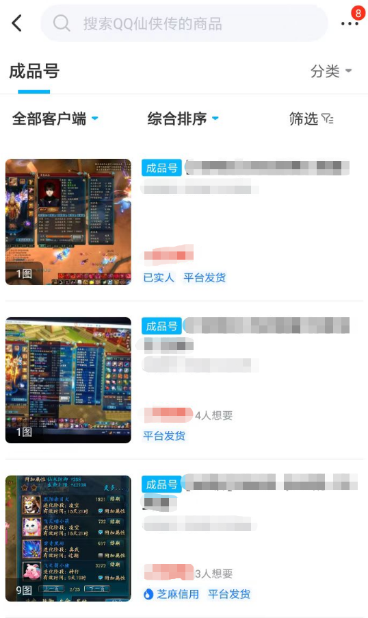 2、首先,对于没有太多时间投入游戏发育的玩家而言,在交易猫平台上,能够以相当实惠的价格直接购入一个优质的精品游戏账号。这类账号不仅能提升大家的游戏体验,还能让玩家了解到游戏后期的部分设定,大家只需进入QQ仙侠传的专区就能获取到这类账号。