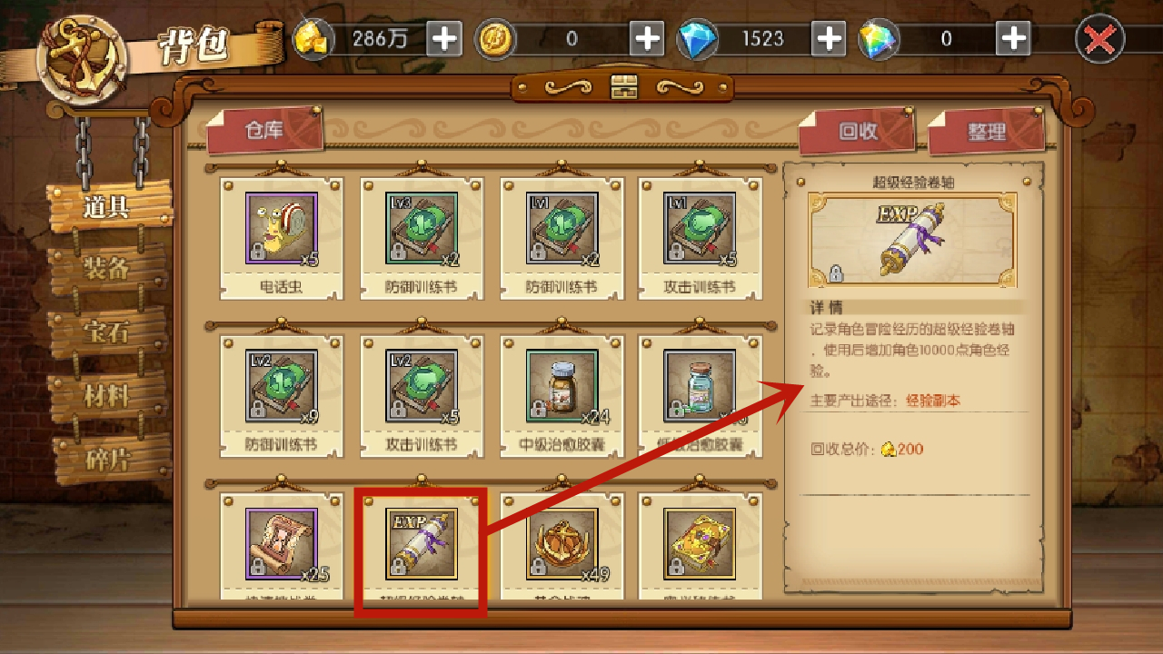 最后要介绍的是超级经验卷轴。就像图中展示的那样,它可以为角色增加10000点经验值,这种道具十分罕见,所以建议务必把它留给SSR英雄来使用。当前获取它的主要方式只有经验副本,另外在少数困难级别的主线任务中也有一定概率能够获得。