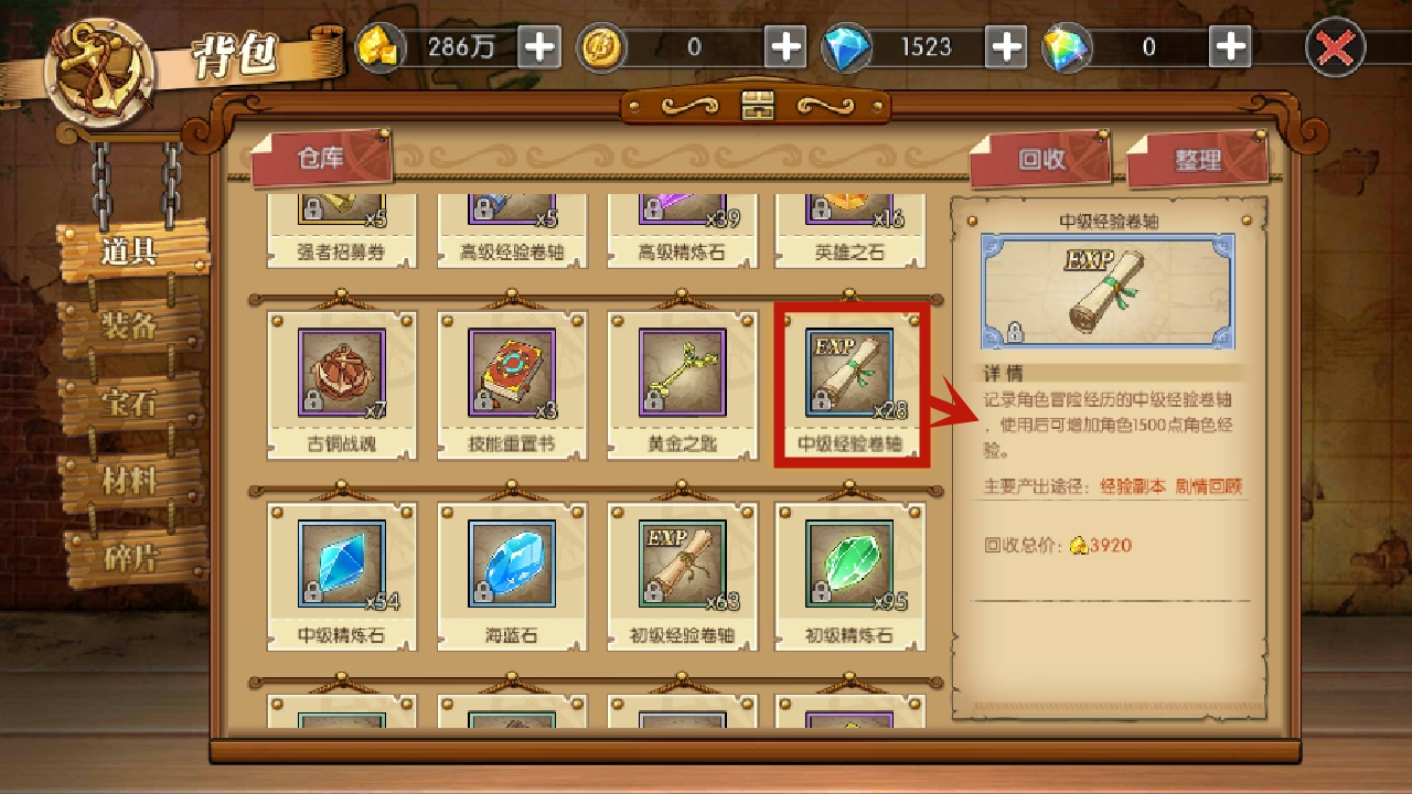 接下来要介绍的是中级经验卷轴。它能为角色提供1500点经验值,数值上是初级卷轴的三倍。不过由于它的稀有度相对较高,所以不太建议将其用在低级英雄身上。