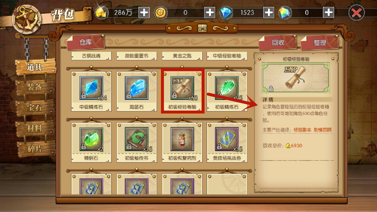 首先是初级经验卷轴。就像图中展示的那样,它能为角色增加500点经验,是游戏里最普遍也最容易获取的卷轴类型。120个初级经验卷轴加起来刚好能给角色提供60000点经验。