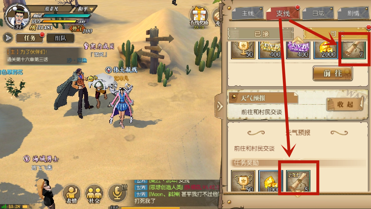 最后,我们来看看最适合新手获取经验卷轴的方式。就像上面的图所展示的那样,在任务栏中,点击主线旁边的支线选项,就能看到许多支线任务。这些任务里,大部分的奖励都包含经验卷轴,并且往往完成起来很容易。所以非常建议新手玩家每天都从这里获取一些经验卷轴。