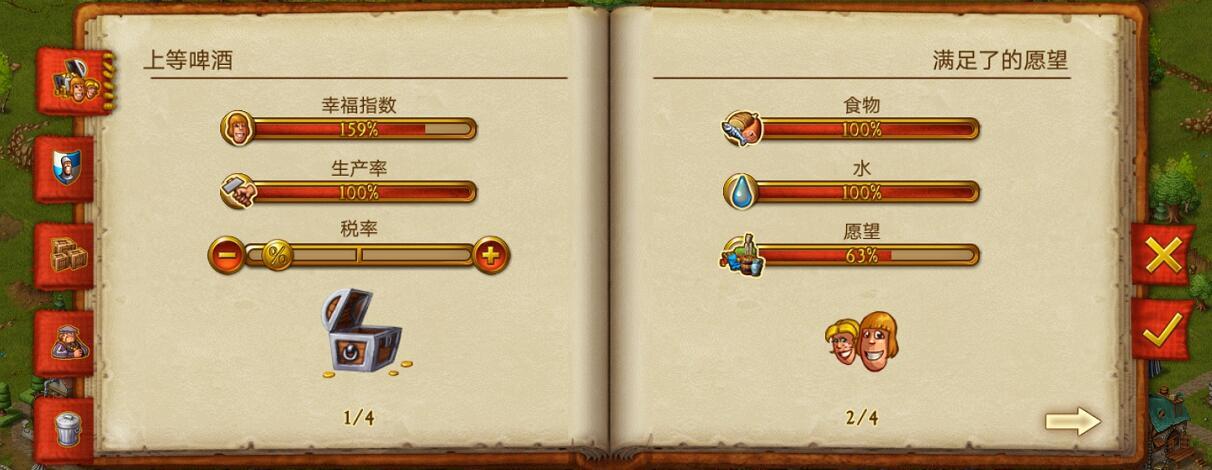 接下来是税收系统,在城镇界面里能够调整税收的额度。游戏设计得很直观,在税收选项下方画了一个宝箱,初始状态下宝箱周围只有少量金币散落着,而税收设置得越高,宝箱周围出现的金币数量就会越多。