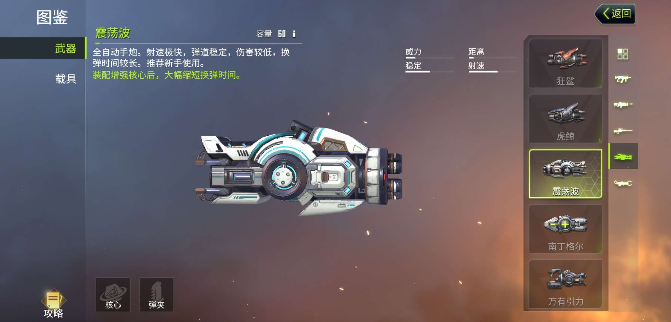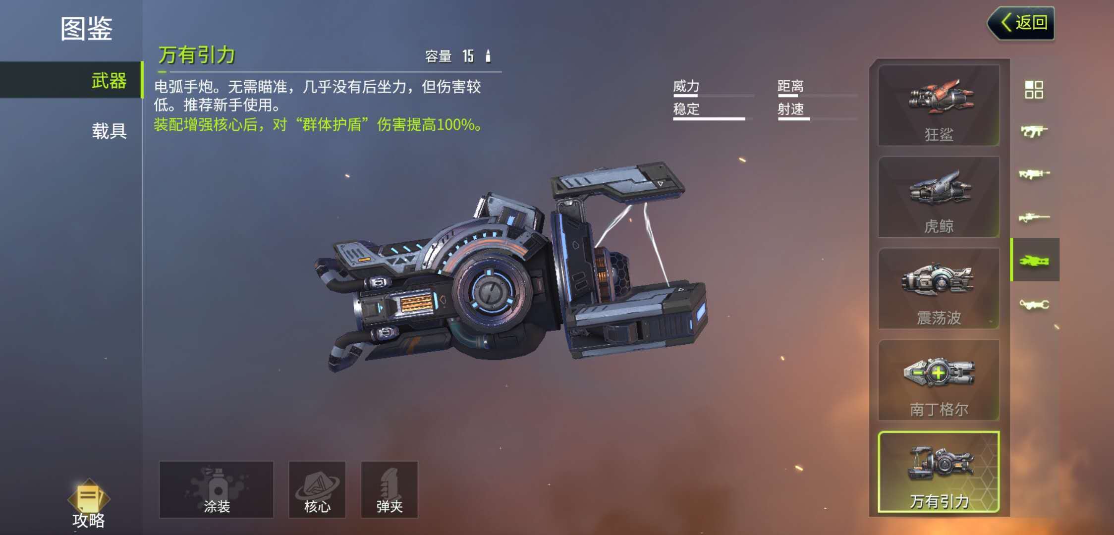 电弧手炮——万有引力,这款手炮的攻击力表现会稍逊一筹,但它无需玩家手动瞄准,能自动捕捉附近敌人并发起攻击,可对多个敌人形成牵制效果。各类手炮的操作方式都很简单,只要会射击就能正常使用,最关键的是要熟悉每种手炮的特性,灵活搭配运用。