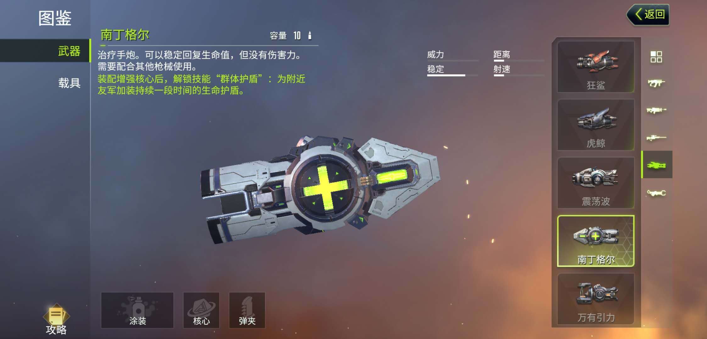 全自动手炮“震荡波”的性能要出色不少,新手操作起来也很顺手。它基础弹容量为60发,若搭配齐全配件,弹容量还能进一步提升。这款手炮几乎兼具弹道稳定、射速快等所有优势,在与队友协同作战时,能提供相当给力的火力支援。而唯一的治疗型手炮“南丁格尔”,使用时只需瞄准受伤的队友射击,就能帮助队友持续且稳定地恢复生命值。