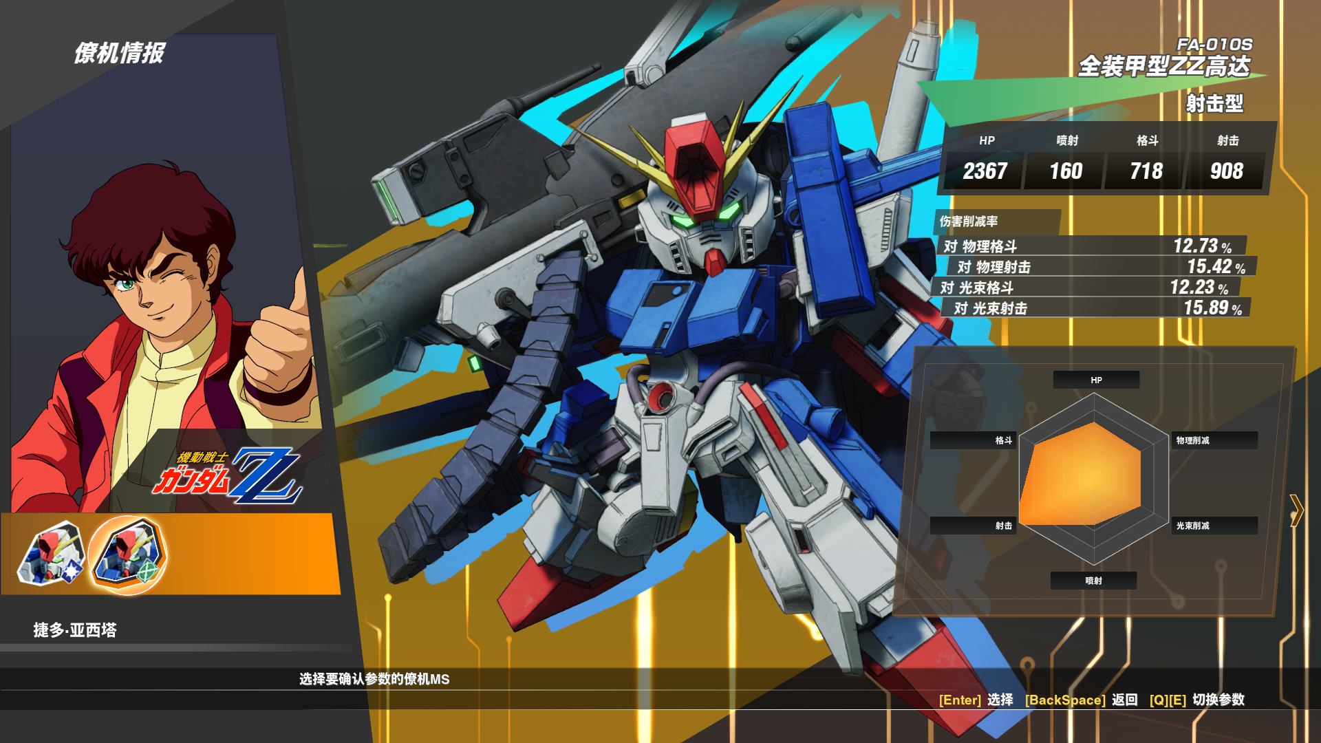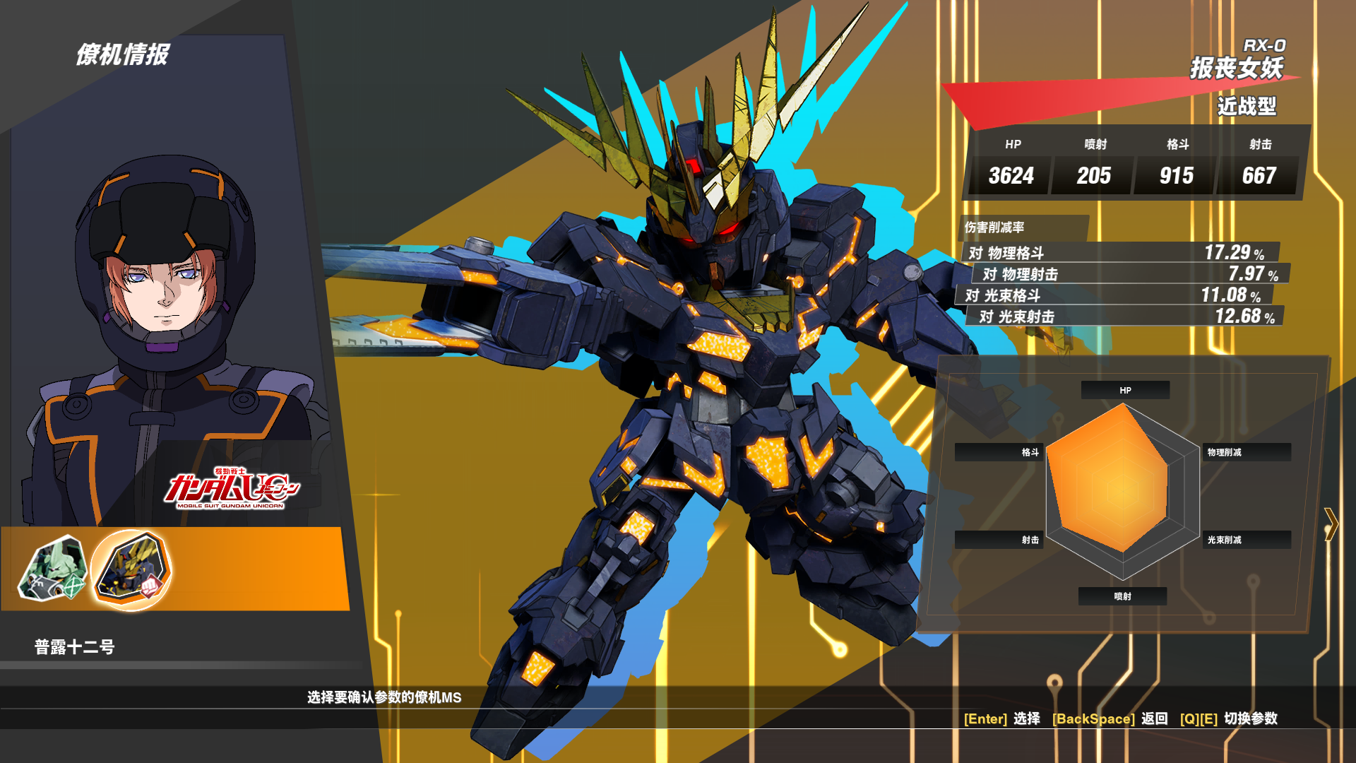 部分高达机型存在不同的改造衍生系列,就拿报丧女妖来说,其基础型号定位为格斗型,但经过改造后会转变为射击型高达。这类射击型机体通常以高射击属性为特点,数值大多在700到800区间。不过报丧女妖的改造版本初始数据表现一般:血量490、喷射能量仅120,格斗属性243,射击属性328。客观来讲,和其他射击型高达相比,这样的初始面板确实显得有些薄弱。好在射击型机体本身容错率较高,并且自带5个修理包——毕竟这类机体的位移能力普遍偏弱。至于其他性能更优的射击型机体,这里就不展开赘述了。
