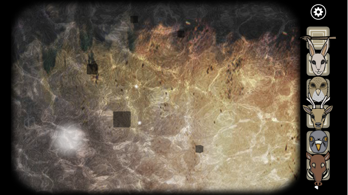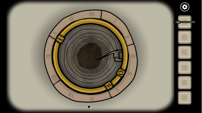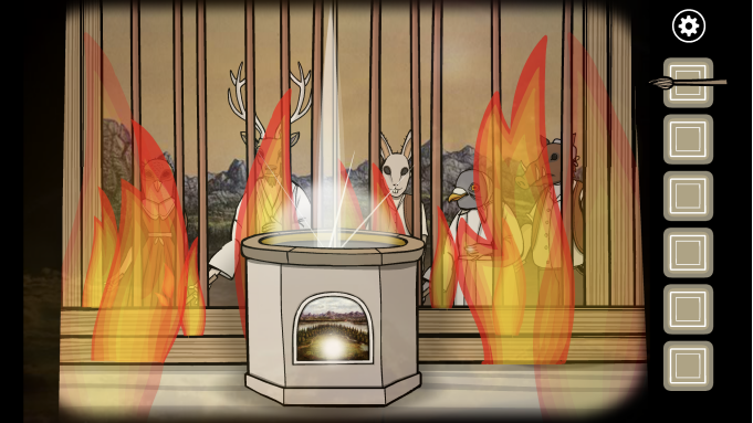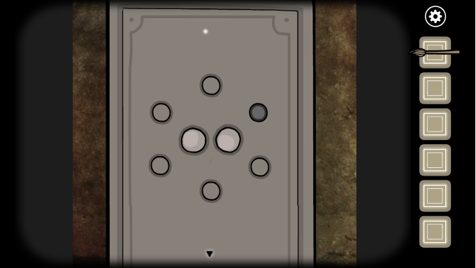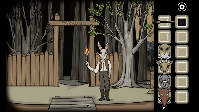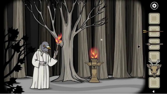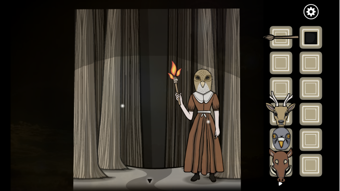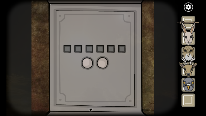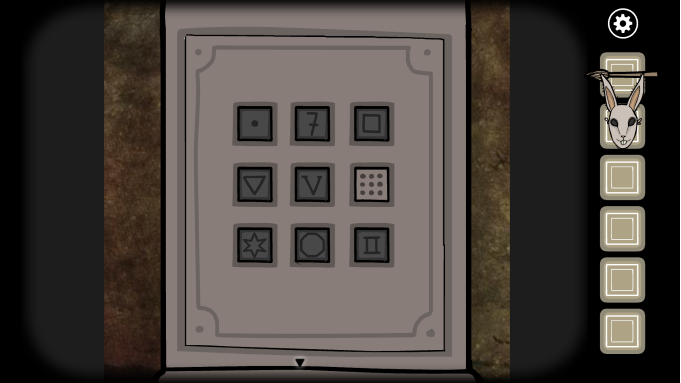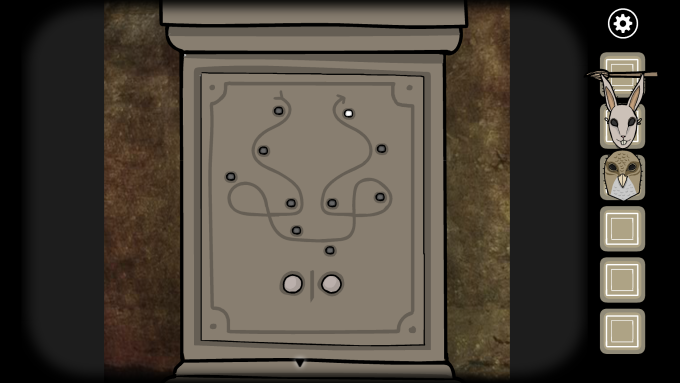 接下来玩家要进行五个小解谜:点击第一个兔子雕像,这里只需要左右轮流点击中间的白色按钮即可,完成几次之后即可获得一个兔子面具。