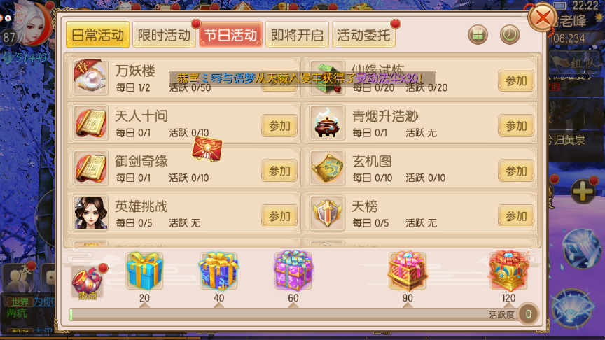 五魁天下的奖励以经验和活血丹为主,另外更关键的是能获得20点活跃度,这可是提升活跃度的好途径。活跃度宝箱的奖励相当丰厚,而且参与这个活动花费的时间不多,特别合适,每天最多还能参与30次呢。