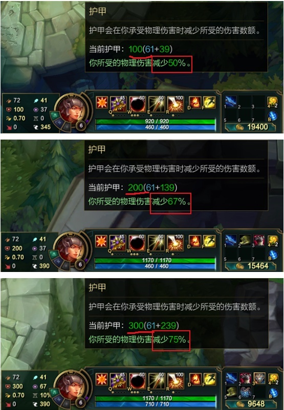 护甲越高,免伤的收益就会逐渐递减。这里要提醒大家,不必一味死堆护甲,堆到一定程度后提升效果就不明显了(敌人有暴击情况的话另当别论)