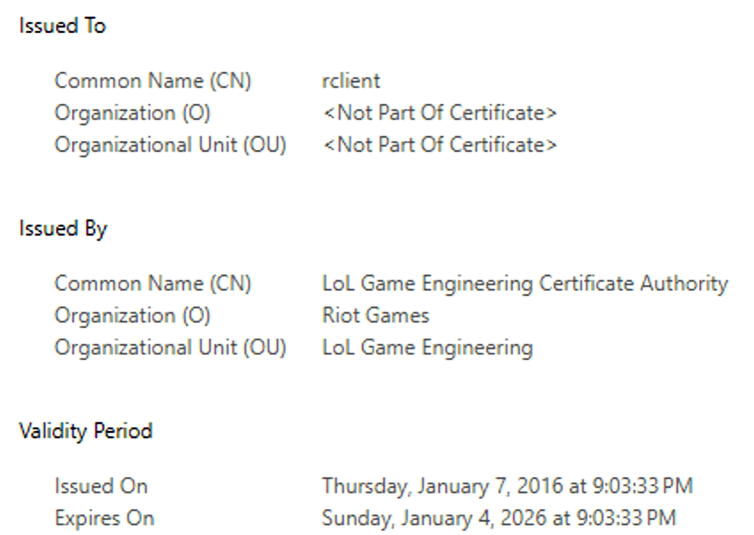 截至目前,拳头游戏仍未正式披露此次故障的具体成因。不过,社区内已有不少反馈称,该问题或许和《英雄联盟》客户端的安全证书过期存在关联。内容创作者Vandiril表示,登录失败是因为客户端证书在故障发生当天恰好到期。虽然拳头游戏尚未对这一观点予以官方证实,但从时间节点来看,其与实际情况是相契合的。