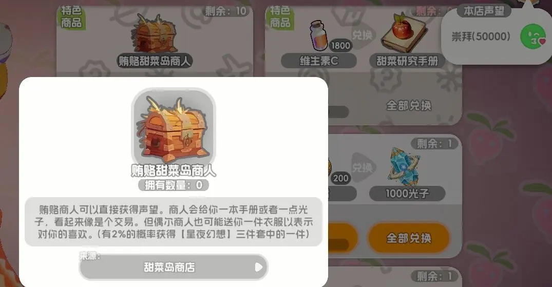 要兑换碎片,得先把三个资源岛的“声望”刷到“崇拜”,这既是前提条件,也是最容易被漏掉的难点。每天一定要在糖、木、石对应的商店里,用VC、VD、VA这几种货币各买5本“手册”——这可是声望的主要获取渠道。不过光靠买手册,声望到不了50000的崇拜门槛,还得额外通过“贿赂商人”,或者提交B5、B6、B3维生素兑换“感受体”来补差额,而且前者提升声望的速度比后者快得多。