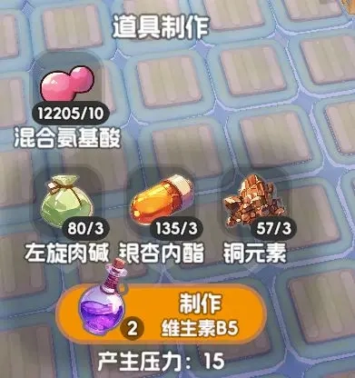 任务所要求的三类终极材料,需搭建一条从一级产物到维生素,再延伸至最终材料的四级生产线。