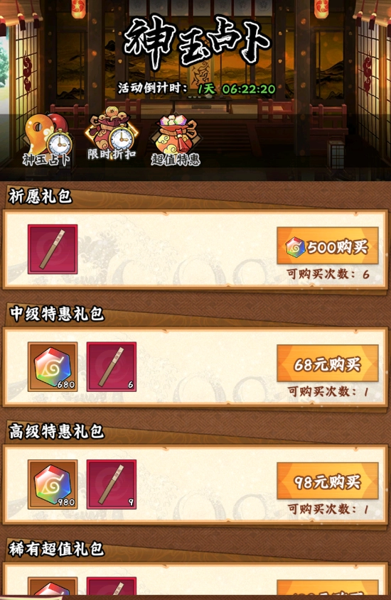 若要购买祈愿签,可消耗忍币,最多能买10个,超出部分就得使用RMB购买。从整体抽奖来看,这样的设置较为划算。所以对于礼包,大家可根据自身实际情况选择是否购买。