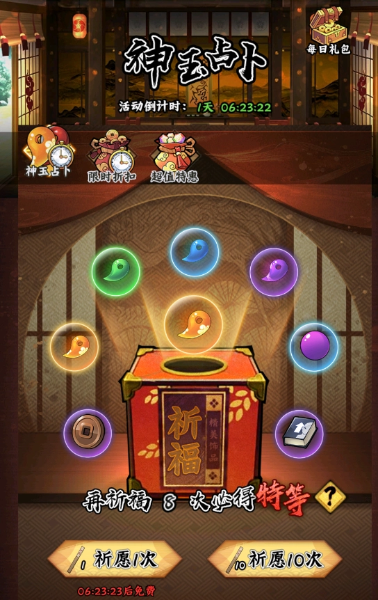 使用祈愿签进行一次祈愿,每累计祈福10次必定能获得一个特等奖——上级饰品。
