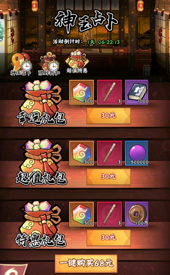 这个礼包优惠力度相当大,只需一键花68元,就能拿下3个价值30元的礼包。里面不仅有祈愿签,还包含1000份进阶手札。要是打算参与这个活动,那这个特惠礼包绝对得入手!
