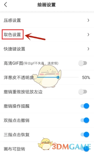 4、随后在“绘画设置”界面中寻找到“取色设置”,点击该选项,从而进入“取色设置”界面。