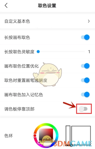 5、进入“取色设置”界面,找到“调色板停靠顶部”这一选项,点击该选项右侧的按钮,使其处于开启状态。