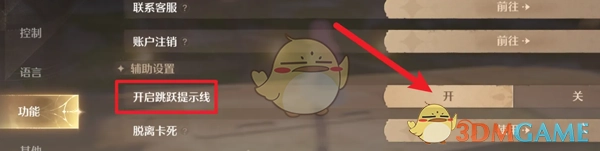 答:进入游戏设置页面后,找到功能选项,选中跳跃提示线并点击开启就可以了。