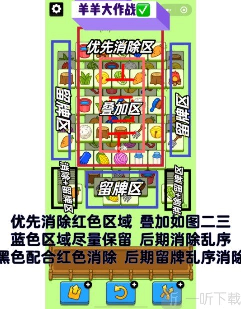 4、在蓝色区域,前期尽可能保留,到后期再结合其他区域进行消除。每次都要争取与叠加区一同消除,最后还能借助道具打乱顺序来完成消除。