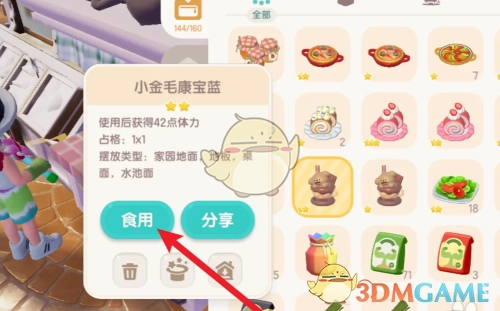 3、在触发的食谱弹框页面,点击“食用”,就能获取42点体力值。